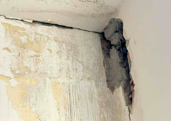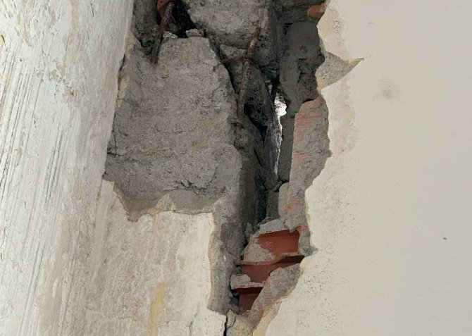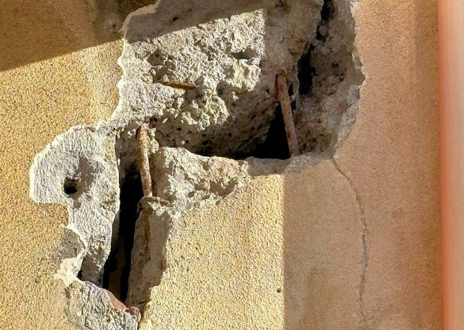 Dai sopralluoghi effettuati è emerso chiaramente un notevole dissesto alla testa del pilastro del primo ordine dell’edificio, lato cortile interno, nella parete opposta alla facciata sulla via principale. In tale punto si riscontra una marcata lesione di taglio e un disgregamento del calcestruzzo, con formazione di cavità nelle quali il materiale risulta completamente assente. La zona in questione risulta particolarmente delicata in caso di eventi sismici, anche a causa dello snervamento dei ferri d’armatura longitudinali.