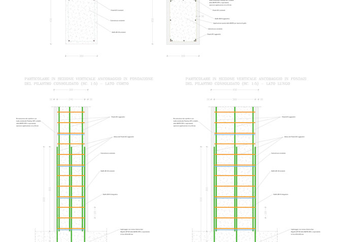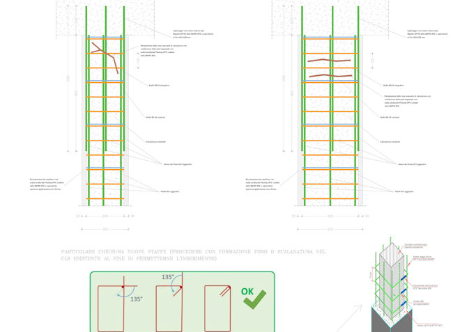 Gli interventi previsti consistono nel ripristino e nel rinforzo locale del pilastro danneggiato, mediante:
